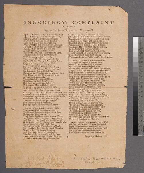 ESTC R2020 ; Signed and dated at end: George Joy, mariner. 1677 ; Verse - "The priests and elders that pernicious seed" ; A condemnation of the Massachusetts laws concerning punishment of Quakers ; Place of publication and printer's name from Wing