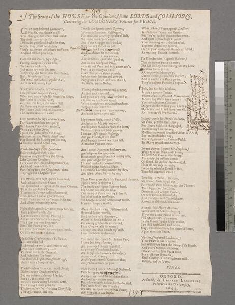 ESTC R212623 ; Verse - "Give eare, beloved Loudoners [sic]," ; A Royalist satire, giving pretended reasons of various Lords and M.P.s for rejecting the idea of peace (Madan) ; "This appears to be a London counterfeit, though in the absence of ornaments it is difficult to be sure."--Madan