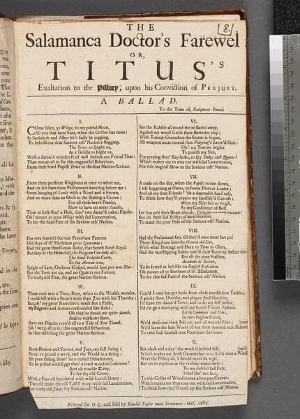 The Salamanca doctor's farewel: or, Titus's exaltation to the pillory, upon his conviction of perjury. A ballad. To the tune of, Packintons pound