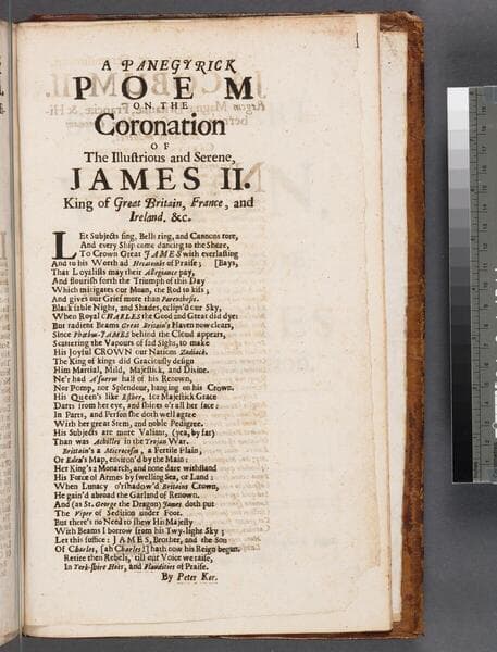 - ESTC R18659 ; Signed at end: Peter Ker, i.e. Patrick Ker ; Verse - "Nunc populi paeana canant, pariterq[ue] triumphent," ; The word "epiphōnētikon" in the title is in Greek characters ; Latin and English in parallel columns. The English text has title: A panegyrick poem on the coronation of the illustrious and serene, James II. King of Great Britain, France, and Ireland, &c ; Imprint from Wing
