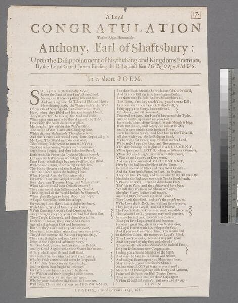 A loyal congratulation to the Right Honourable, Anthony, Earl of Shaftsbury: upon the disappointment of his, the King and kingdoms enemies, by the loyal grand jurie's finding the bill against him ignoramus. In a short poem