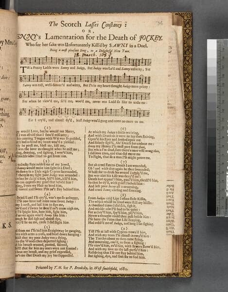 The Scotch lasses constancy: or, Jenny's lamentation for the death of Jockey. Who for her sake was unfortunately kill'd by Sawny in a duel. Being a most pleasant new song, to a delightful new tune