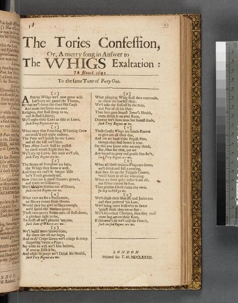 ESTC R206506 ; Attributed by Wing to Thomas D'Urfey, but according to the Bodleian Library ballads database, "Originally written by Francis Quarles, but added to by Tom D'Urfey and others". Perhaps D'Urfey's contribution is limited to the expanded version, titled "The Whig rampant" ; Verse - "Now now the Tories all shall stoop, religion and the laws, and Whigs on Commonwealth"