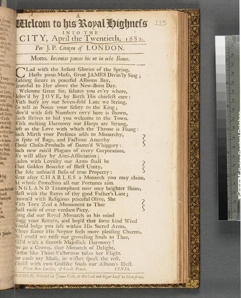 A welcom to his Royal Highness into the city, April the twentieth, 1682. Per J.P., citizen of London