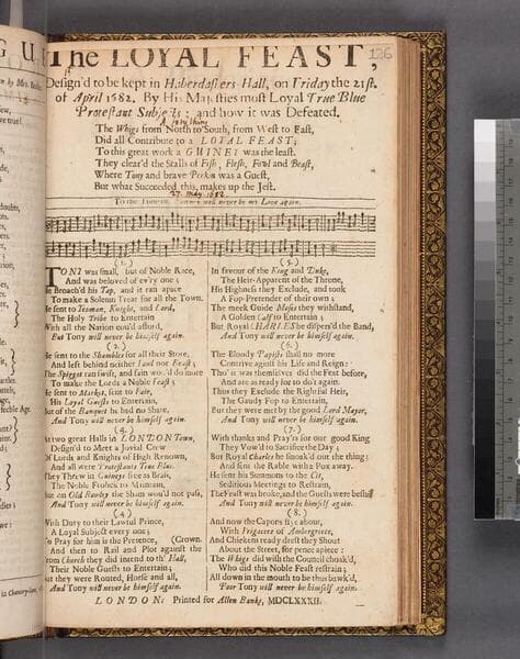 The loyal feast, design'd to be kept in Haberdashers-Hall, on Friday the 21st. of April 1682. by His Majesties most loyal true blue Protestant subjects and how it was defeated. The Whigs from north to south, from west to east, did all contribute to a loyal feast to this great work a guiney was the least. They clear'd the stalls of fish, flesh, fowl and beast, where Tony and brave Perkin was a guest, but what succeeded this, makes up the jest. To the tune of, Sawney will never be my love again