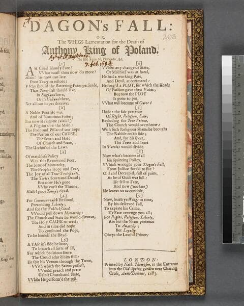 Dagon's fall: or, The Whigs lamentation for the death of Anthony King of Poland, to the tune of, Philander, &e [sic]
