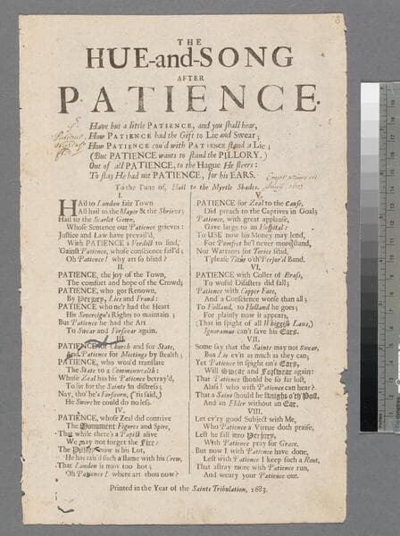 The hue-and-song after Patience· Have but a little patience, and you shall hear, how Patience had the gift to lie and swear how Patience cou'd with patience stand a lie (but Patience wants to stand the pillory.) Out of all patience, to the Hague he steers: to stay he had not patience, for his ears. To the tune of, Hail to the myrtle shades