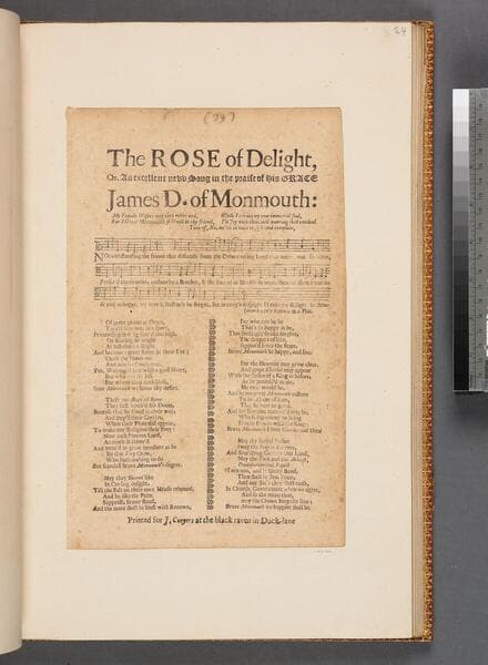 The rose of delight, or, An excellent nevv song in the praise of His Grace James D. of Monmouth: My female wishes may they never end, for I great Monmouth still will be thy friend, while I retain my poor immortal soul, I'le joy with thee, and wanting thee condoul. Tune of, No, no 'tis in vain to sigh and complain