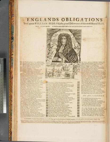 Englands obligations to Captain William Bedloe, the grand discoverer of this most horrid plot. Part I. The second impression. In which are added emblems of his loyalty and the Jesuits treachery and cruelty