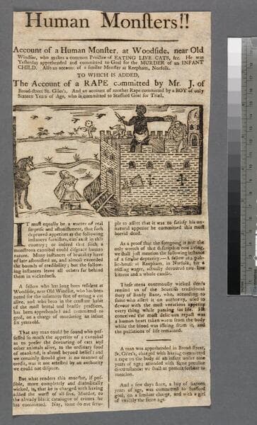 Human monsters!! Account of a human monster, at Woodside, near Old Windsor, who makes a common practice of eating live cats, &c. He was yesterday apprehended and committed to goal for the murder of an infant child. Also an account of a similar monster at Reepham, Norfolk. To which is added, the account of a rape committed by Mr. J. of Broad-street St. Giles's. And an account of another rape committed by a boy of only sixteen years of age, who is committed to Stafford Goal for trial