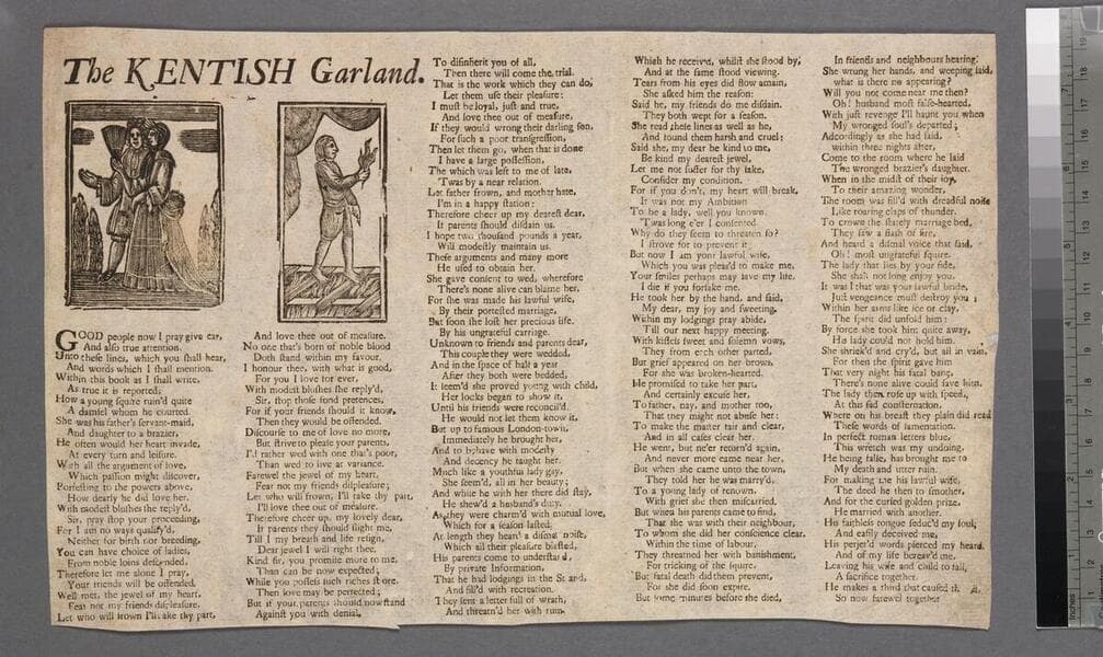 ESTC T35276 ; Verse - "Young men and maids I pray give ear,". ; Imprint conjectured by cataloguer.;In three columns with a woodcut of a man and a woman, and the title, above all of the columns the columns are separated by lines of ornamental type.