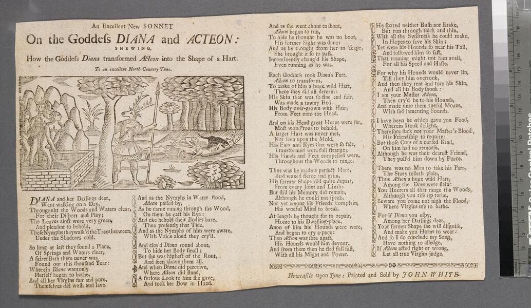 An excellent new sonnet on the goddess Diana and Acteon: shewing, how the goddess Diana transformed Acteon into the shape of a hart. To an excellent north country tune