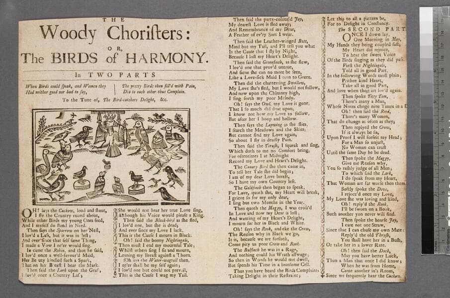The woody choristers: or, the birds of harmony. In two parts. When birds could speak, and women they had neither good nor bad to say, the pretty birds then fill'd with pain, did to each other thus complain. To the tune of, The bird-catchers delight, &c