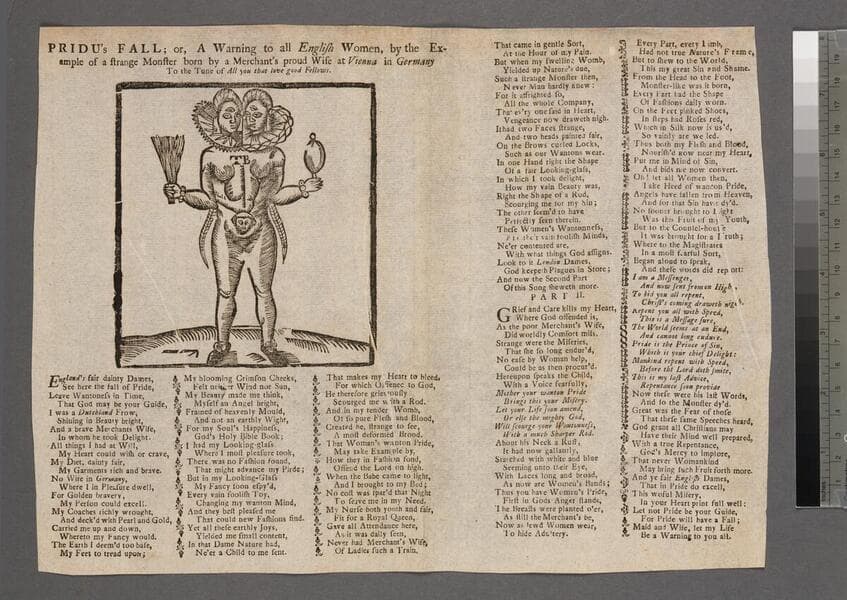 Pridu's [sic] fall or a warning to all English women, by the example of a strange monster born by a merchant's proud wife at Vienna in Germany. To the tune of All you that love good fellows