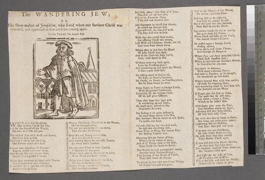 The wandering Jew or, the shoe-maker of Jerusalem, who lived when our saviour Christ was crucified, and appointed to live until his coming again. To the tune of, The ladies fall