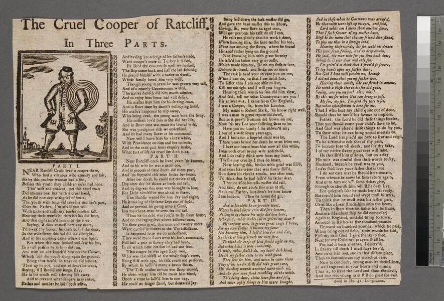ESTC N68226 ; Verse - "Near Ratcliff-Cross lived a Cooper there". ; In this edition, the text is in four columns with the title above the first two columns. There is a woodcut above the first column of a man standing with a hose wrapped around his left arm. The text is not separated by any rules.