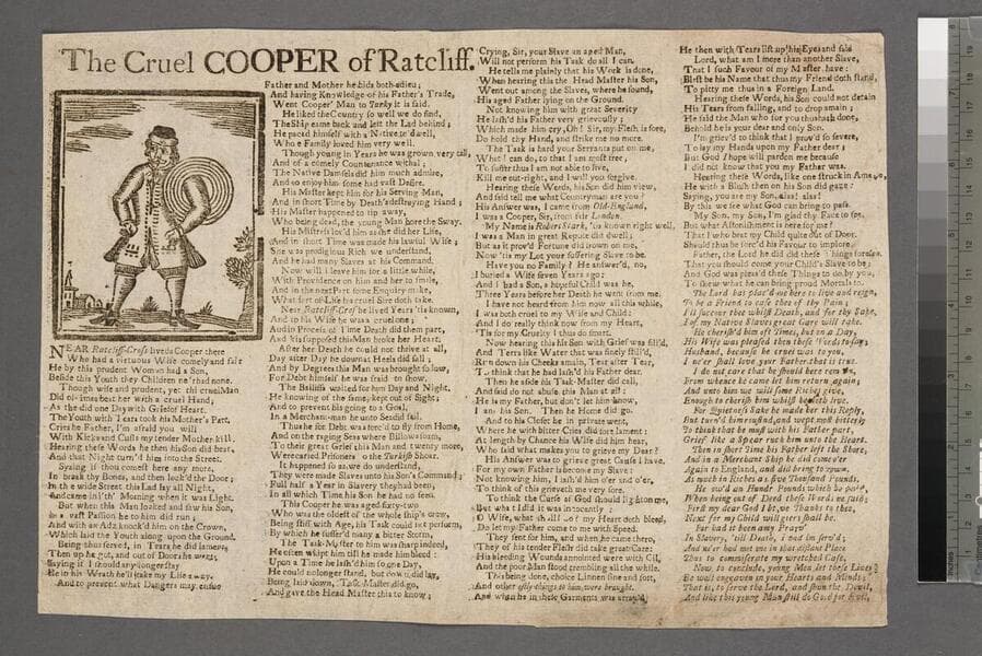 ESTC T34446 ; J. Evans at this address 1792-1839 (Maxted). ; Verse - "Near Ratcliff Cross lived a cooper there,". ; In four columns with the title above the first two and the woodcut above the first the columns are separated by ornamental rules.