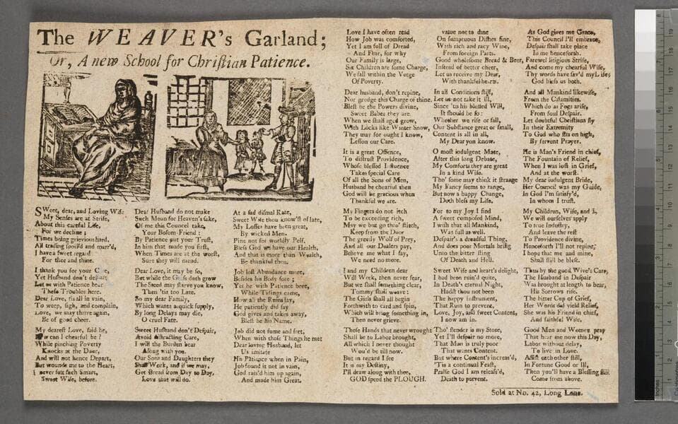 ESTC N68219 ; Verse - "Good people now I pray give ear,". ; In five columns with the title and two woodcuts above the first two the columns are not separated by rules. The woodcut above the first column is a picture of a couple walking together. The second woodcut above the second column is a man holding a plant in his hand.