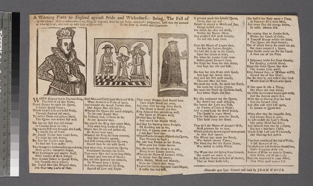 A warning piece to England against pride and wickedness: being, the fall of Queen Eleanor, wife to Edward the first, King of England, who for her pride, and God's judgments, sunk into the ground at Charing-Cross, and rose up with life at Queen-hith. To the tune of, Gentl and courteous