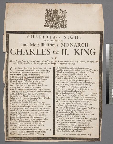 Suspiria, or Sighs on the death of the late Most Illustrious Monarch Charles the II. King of Great Britain, France and Ireland, &c. who changed his earthly for a heavenly crown, on Fryday the 6th. of February 1684/5. in the 37th year of his reign, and 55th of his age