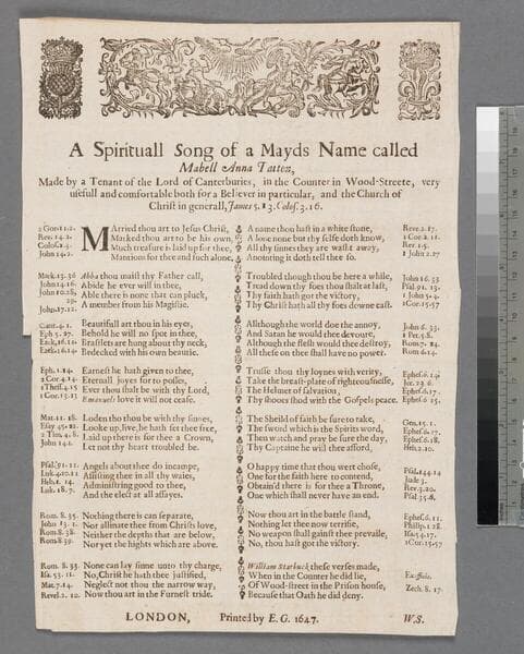 A spirituall song of a mayds name called Mabell Anna Tatton, made by a tenant of the Lord of Canturburies, in the counter in Wood-Streete, very usefull and comfortable both for a believer in particular, and the Church of Christ in generall, James 5. 13. Colos. 3. 16