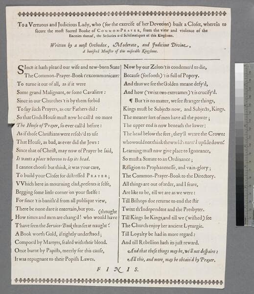 To a vertuous and judicious lady, who (for the exercise of her devotion) built a closet, wherein to secure the most sacred Booke of Common-Prayer, from the view and violence of the enemies thereof, the sectaries and schismatiques of this kingdome. Written by a most orthodox, moderate, and judicious divine, a banished minister of this miserable kingdome