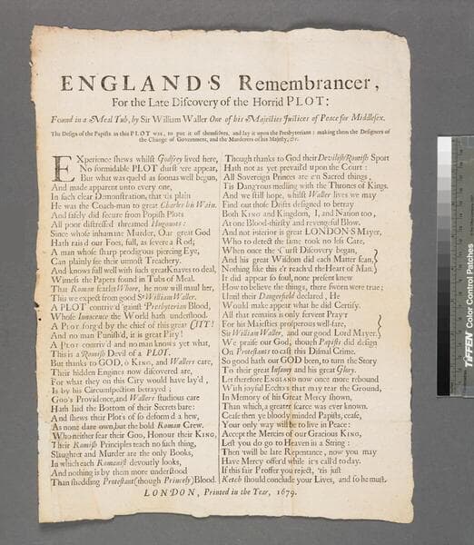 England's remembrancer, for the late discovery of the horrid plot: found in a meal tub, by Sir William Waller one of His Majesties justices of peace for Middlesex. The design of the papists in this plot was, to put it off themselves, and lay it upon the Presbyterians: making them the designers of the change of government and the murderers of His Majesty, &c