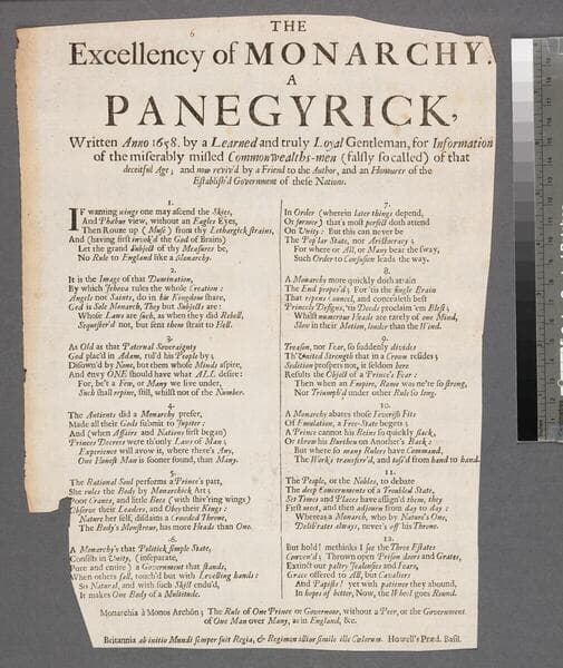 The excellency of monarchy. A panegyrick, written anno 1658. by a learned and truly loyal gentleman, for information of the miserably misled Commonwealths-men (falsly so called) of that deceitful age and now reviv'd by a friend to the author and an honourer of the establish'd government of these nations