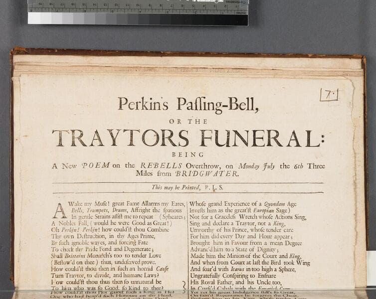 Perkin's passing-bell, or, The traytors funeral: : Being a new poem on the rebells overthrow, on Monday July the 6th three miles from Bridgwater