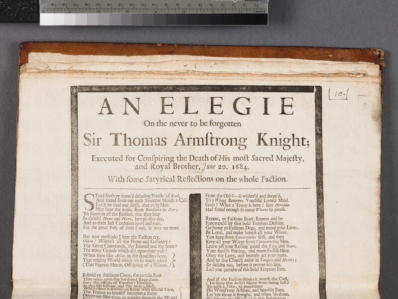 An elegie on the never to be forgotten Sir Thomas Armstrong Knight executed for conspiring the death of His most sacred Majesty, and royal brother, June 20. 1684. With some satyrical reflections on the whole faction