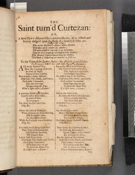 The saint turn'd curtezan: or, A new plot discover'd by a precious zealot, of an assault and battery design'd upon the body of a sanctify'd sister, &c. Who in her husband's absence, with a brother did often use to comfort one another till wide mouth'd Crop, who is an old Italian, took his mare napping, and surpriz'd her stallion: who 'stead of entertainment from his mistris, did meet a cudgelling not match'd in hist'ries. To the tune of the Quakers ballad: or, All in the land of Essex