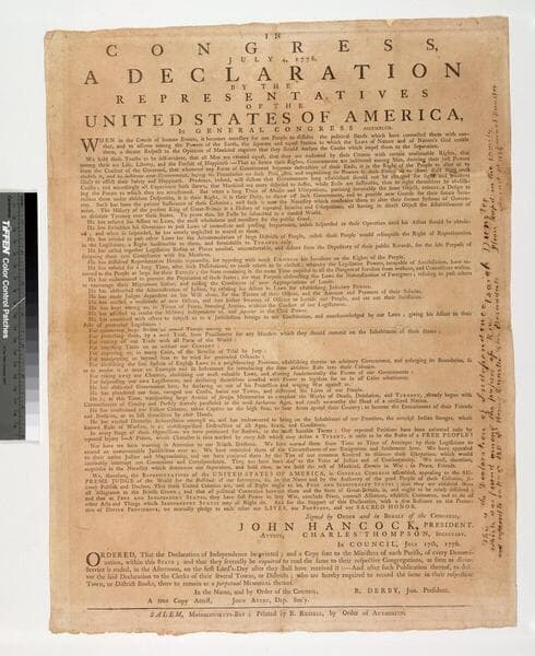 Copy of John Holt's broadside of the Declaration of Independence with the "Extract from the Minutes" containing the draft version of the resolution of the Fourth Provincial Congress of New York approving the Declaration of Independence; attested by Robert Benson (1739-1823), a secretary of the Fourth Provincial Congress in White Plains. With manuscript annotations by John McKesson (1734-1798), another secretary of the Fourth Provincial Congress in White Plains. Within an elaborate border of type ornaments; the Declaration of Independence is printed in two columns separated by a line of ornaments. The typeset is similar to the broadside that Holt published on July 11, 1776, as an insert in that day's issue of "The New York Journal or General Advertiser.” The manuscript notes on the verso are drafts of the minutes taken on the morning and afternoon of July 9, 1776. The morning entry documents the seating of the delegates from Cumberland County, and the afternoon entry, the tally of the votes for the resolution approving the Declaration of Independence. The annotations on the recto expand and amend the text of the resolution to include the clause authorizing the New York delegates at the Second Continental Congress to vote for "all such measures as they may deem conducive to the happiness & welfare of the United States of America." The last note is dated July 30, 1776 and describes the seating of the delegates from Gloucester County.