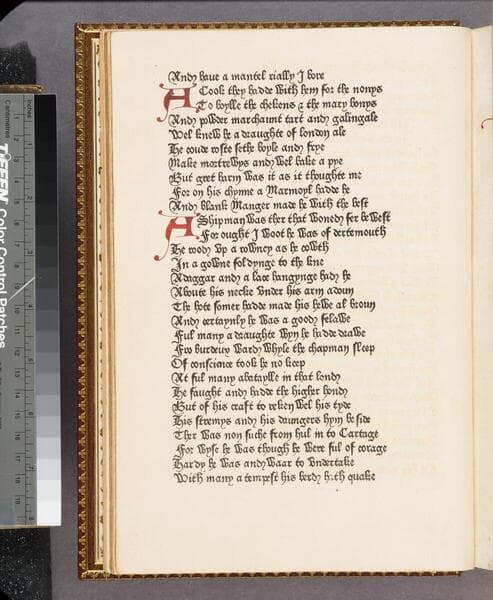 Side notes and headings in red. "Besides Burne-Jones's eighty-seven pictures, it contains a full-page woodcut title, fourteen large borders, eighteen borders or frames for the pictures, and twenty-six large initial words. All of these, besides the ornamental initial letters large and small, were designed by Morris himself."--The life of William Morris by J. W. Mackail, v. 2 "The hearty thanks of the editor and printer are due to the Reverend Professor Skeat for kindly allowing the use of his emendations to the Ellesmere ms. of the Canterbury tales, and also of his emended texts of Chaucer's other writings." Printed on vellum. Probably a trial page.