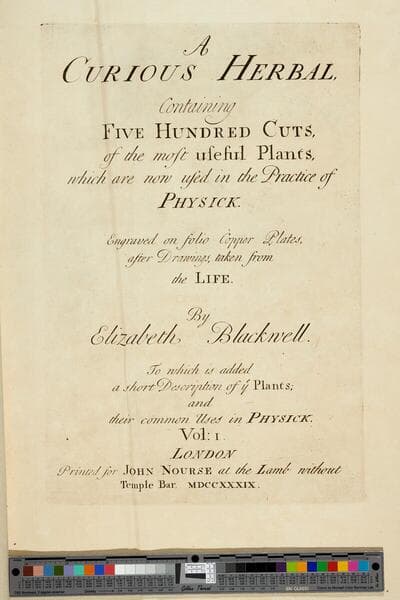 A curious herbal, : containing five hundred cuts, of the most useful plants, which are now used in the practice of physick. Engraved on folio copper plates, after drawings taken from the life. / By Elizabeth Blackwell. To which is added a short description of ye plants; and their common uses in physick. Vol: I