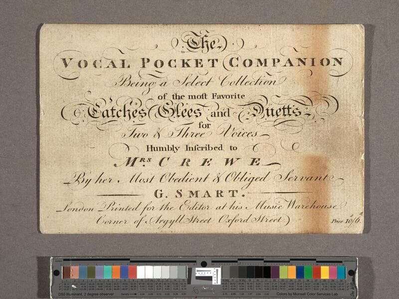 The vocal pocket companion : being a select collection of the most favorite catches glees and duetts for two & three voices ; humbly inscribed to Mrs. Crewe by her most obedient & obliged servant G. Smart
