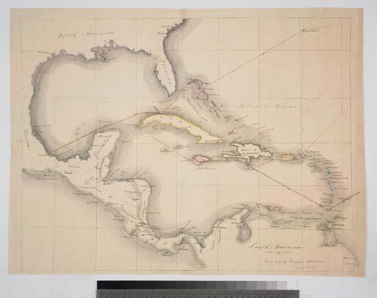 Kashnor notes, "Mexico, Vera Cruz, Yucatan, Honduras, Guatemala." Prime meridian: GM. Relief: hachures. Graphic Scale: Miles, leagues. Projection: Pseudocylindrical. Printing Process: Engraving. Verso Text: Ms note: 681.
