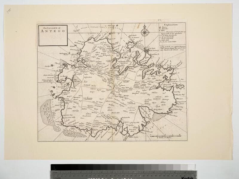 Kashnor notes, " A scarce map, showing the plantations and the names of the owners." MS note: 743 (on backing). Relief: pictorial. Graphic Scale: Miles. Projection: Plane. Printing Process: Copper engraving. Verso Text: MS note: 743 (on backing).