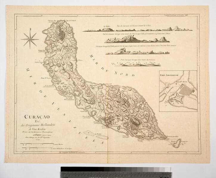 See also 093:761M for French version of this map with earlier date. Submap: Plan of Fort Amsterdam. Vignettes: Four island views from sea.. Prime meridian: London, Ferro. Relief: hachures. Graphic Scale: Leagues. Projection: Plane. Printing Process: Copper engraving. Other Features: Sub-mapsVignettes. Verso Text: MS note: 762.