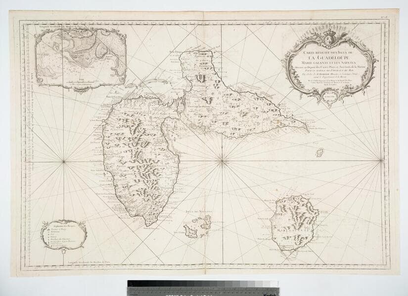 Carte Reduite des Isles de la Guadaloupe Marie Galante et les Saintes Dresée au Depost des Cartes Plans et Journaux de la Marine Pour le Service des Vaisseaux du Roy Par Ordre de M. Berryer Ministre et Secretaire d Etat aiant le Departement de la Marine. Par le Sr. Bellin Ingeneur de la Marine et du Depost des Plans Confuer Royal de l'Academie de Marine et de la Societe Royale de Londres. MDCCLIX (1759)