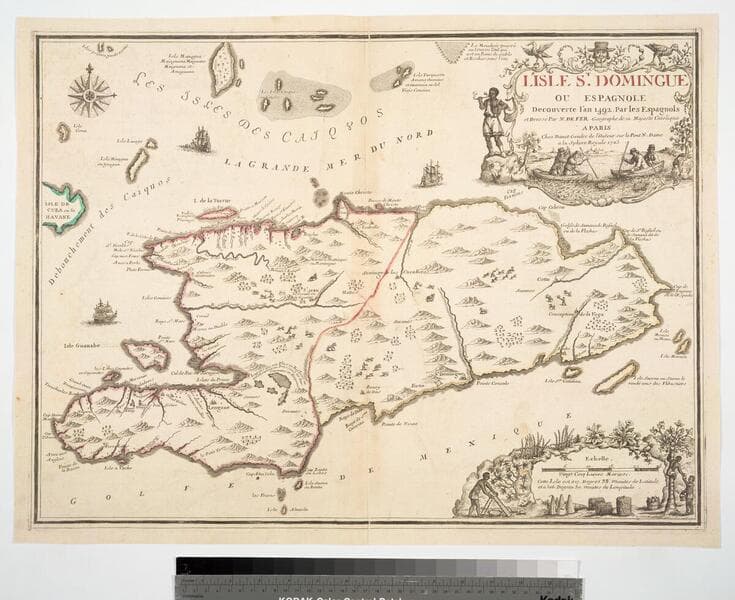 Carte de l'Isle de Saint Domingue Dresée en 1722 por le l'usage du Roy Sur les memoires de Mr. Frezier Ingenieur de. S. M. el autres assujetis aux Observations Astronomiques. Par G. Delisle premier Geographe du Roy, de l'Academie Rle. des Sciences. A Paris Chex l'Auteur sur le Quay de l'Horloge