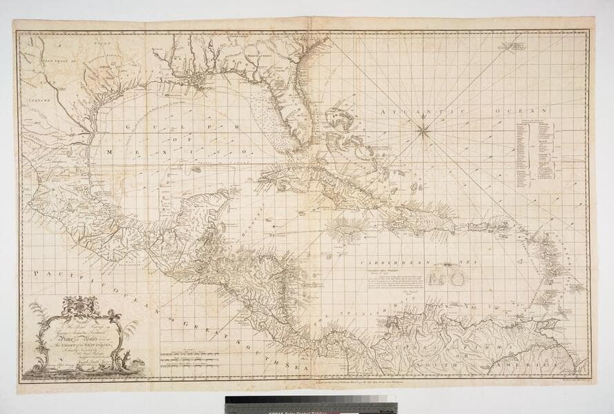 Certified correct by Plantation Office, Whitehall January 25, 1774. Color coded by nationalities. Cartouche: British coat of arms. Prime meridian: London. Relief: pictorial. Graphic Scale: Miles, leagues. Projection: Cylindrical. Printing Process: Copper engraving. Verso Text: MS notes : 295818 69.