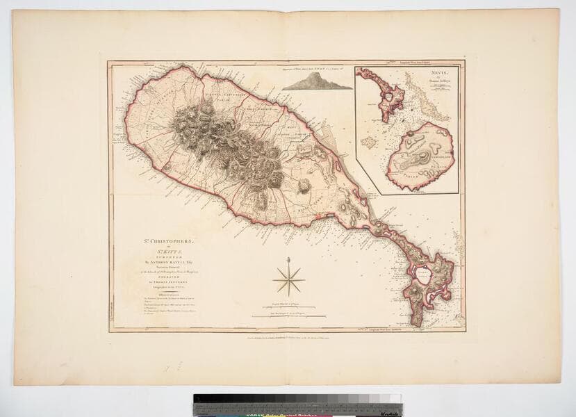 St. Christophers, or St. Kitts, surveyed By Anthony Ravell Esqr. Surveyor General of the Islands of St. Christophers, Nevis, & Montserrat. Engraved by Thomas Jefferys Geographer to the King