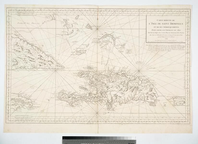 Carte Réduite de l'Isle de Saint Domingue et des ses Débouquements pour Servir aux Vaisseaux du Roy. Drésée au Dépot des Cartes Plans et Journaux de la Marine Par Ordre de M .Rouillé Chr. Comte de Jouy, &at Secretaire d'Etat ayant le Dvpartement de la Marine. 1750