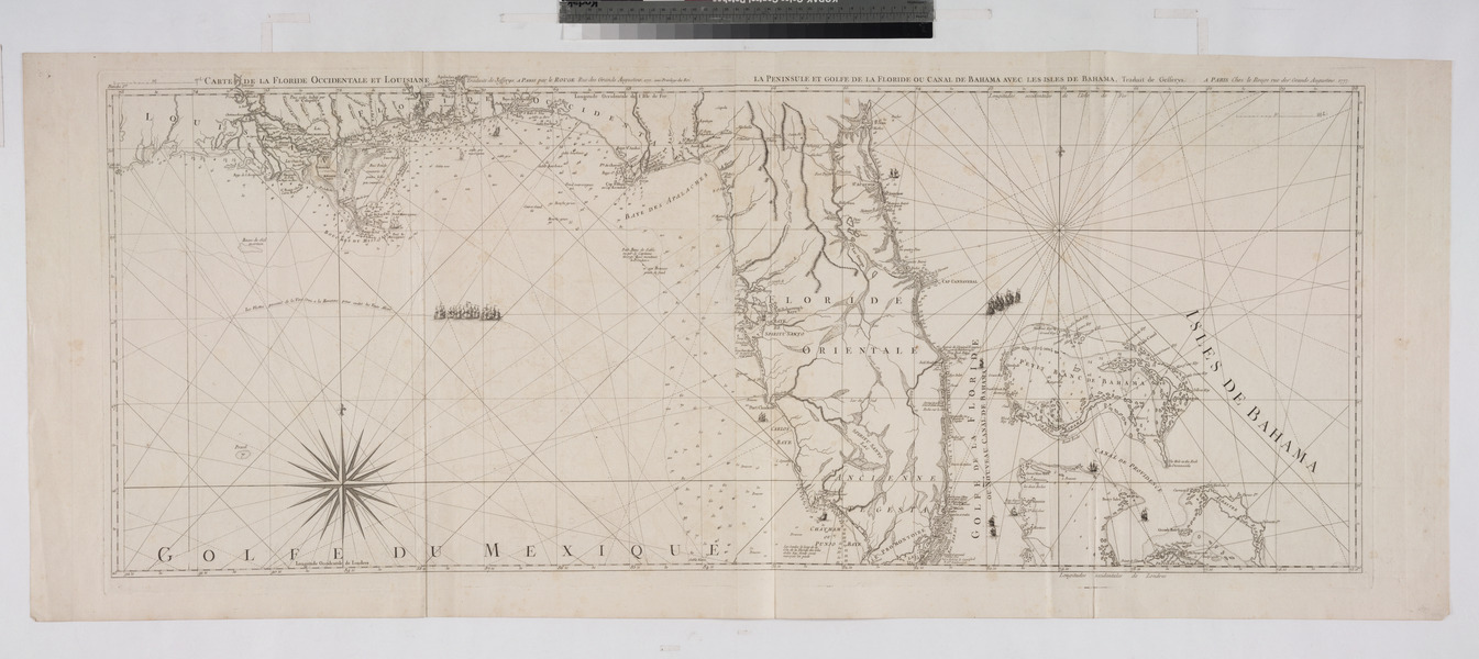 Kashnor notes, "a scarce map [after Jefferys] issued for the use of the French allies during the Revolution." One map in two sheets. Navigational notes, compass variations, various voyages. Author and appeared in references from RLIN record [this record for upper section] Three compass roses. . Prime meridian: London, Ferro. Relief: no. Graphic Scale: Leagues, Marine. Projection: Mercator. Watermark: Chained Maltese Cross Dupys Moyen(?). Printing Process: Copper engraving. Verso Text: MS notes : 34 (upper) 56 (lower) 63.
