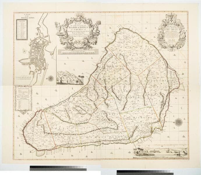 Kashnor notes, "Dedicated to James Bridges, Duke of Chandos. With inset plan of Bridgetown, prospect of Codrington College, and engraving representing the making of the survey; also statistics of population." See also 105:174 for another copy. Two elaborate cartouches. Submap - A Plan of Bridgetown. A view of Codrington College. View of surveyor with plane table, and native assistants with measuring wheel, surveying pole and chain. . Prime meridian: London. Relief: pictorial. Graphic Scale: Miles. Projection: Plane. Watermark: IHS LV II --DARY. Printing Process: Copper engraving. Other Features: CartoucheSub-mapsVignettes. Verso Text: Ms notes: 745 47.