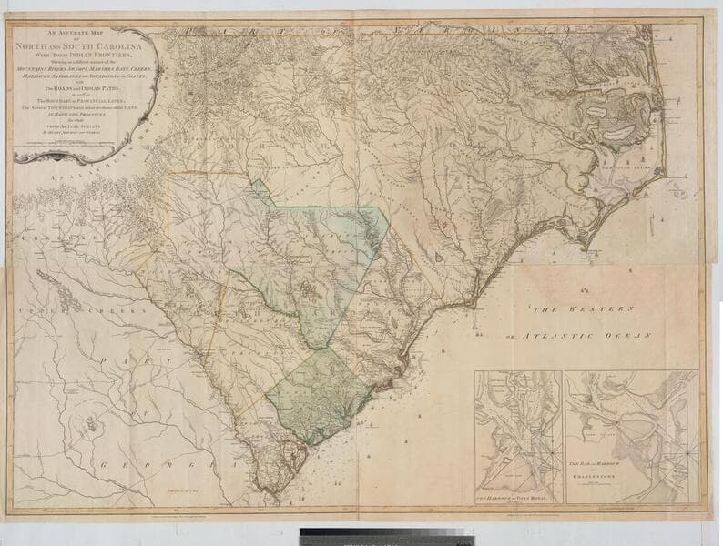 Accurate Map of North and South Carolina with their Indian Frontiers, showing in a distinct manner all the Mountains, Rivers, Swamps, Marshes, Bays, Creeks, Harbours, Sandbanks and Soundings on the Coast, with the Roads and Indian Paths as well as the Boundary or Provincial Lines, the Several Townships and other divisions of the Land in Both the Provinces; the whole from Actual Surveys by Henry Mouzon and others