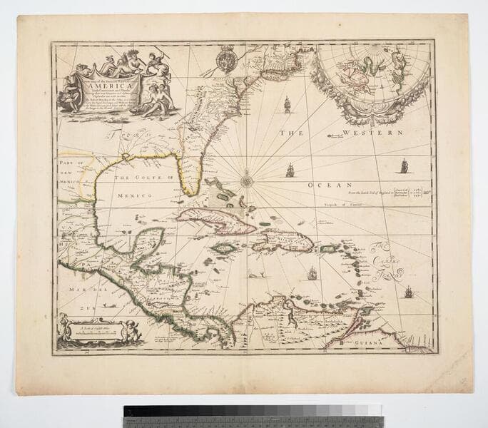 Kashnor notes, "With inset maps of New Scotland, Carolina, Jamaica, Bermudas and Barbadoes." Kashnor dates as [1698]. McCorkle suggests 1700, gives appeared in information. Submaps: Carolina; New Scotland; I. of Jamaica; Bermudaz or Sommers Isles; I of Barbados. MS note:461 (on backing). Prime meridian: London. Relief: no. Projection: Mercator. Printing Process: Copper engraving. Other Features: Sub-maps. References: McCorkle 700.9. Verso Text: MS note: 93/461 (on backing).