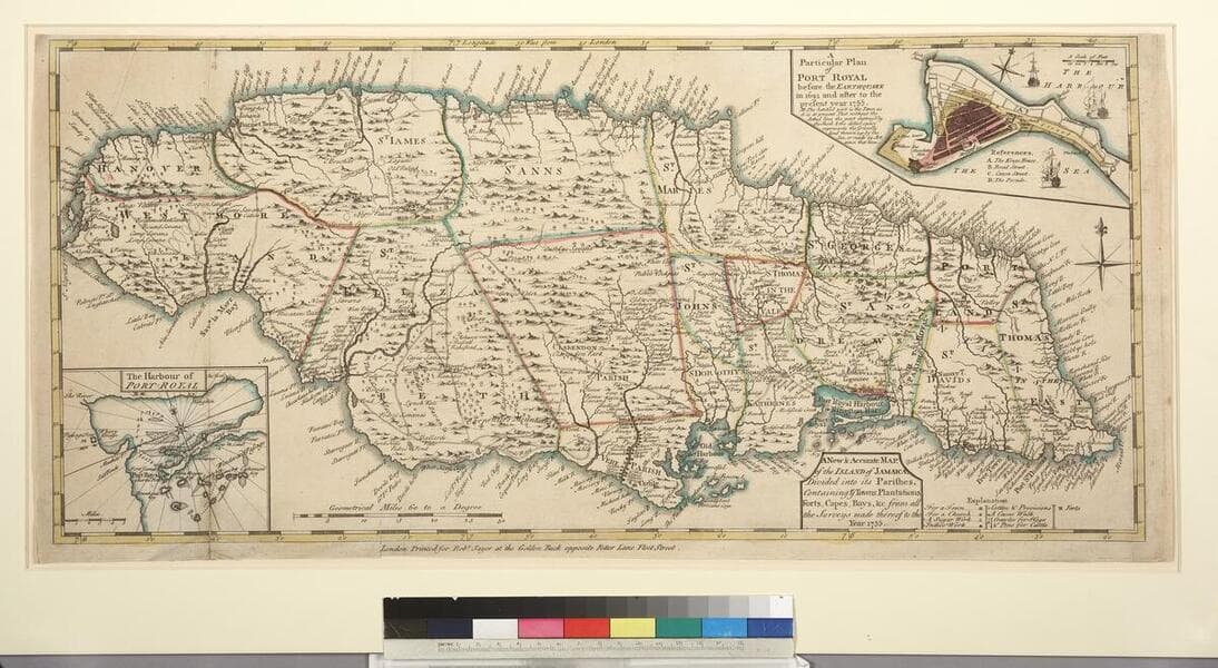 New & Accurate Map of the Island of Jamaica Divided into its Parishes, Containing theTowns, Plantations, Forts, Capes, Bays, &c. from all the Surveys made there of the Year 1755