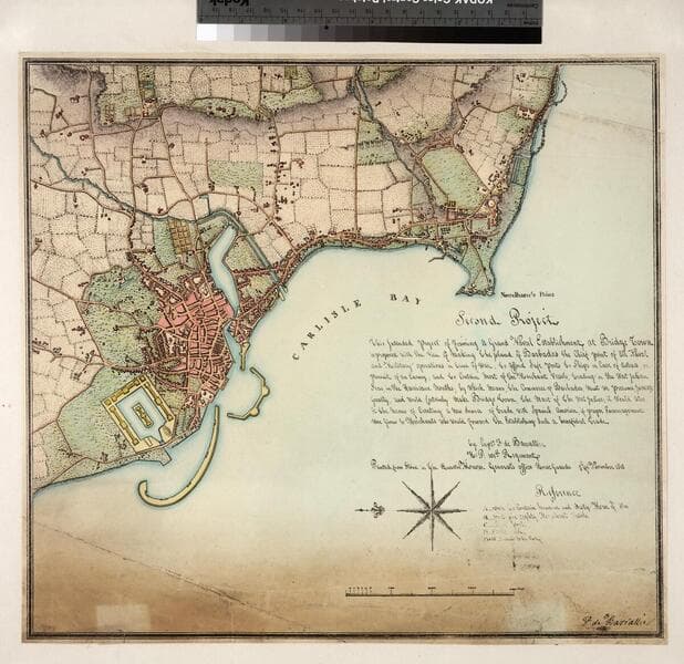 Second Project.This intended project of joining a grand naval Estabilshment at Bridge Town is proposed with the view of making the island of Barbados the chief point of all naval and military operations in time of War, to afford safe ports to ships in case of distress, pursuit of an enemy; and to contain most of the Merchant Vessels, trading in the West Indian Seas, in the Hurricane months; by which means, the Commerce of Barbados must we presume, increase greatly, and would certainly make Bridge Town, the Mart of the West Indies; it would also be the means of creating a New Source of Trade with Spanish America if proper Encouragement were given to Merchants who would forward the Establishment such a benificial Trade. by. Capt. F. de Barrallier. H.Q. 101st Regiment