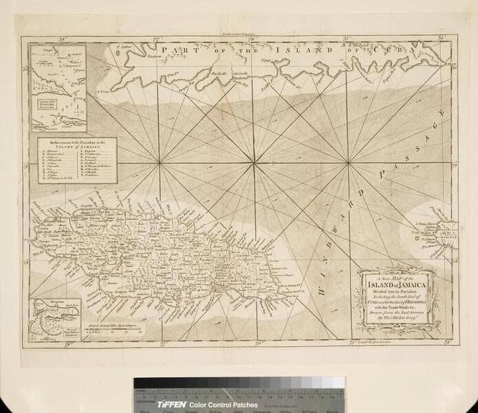 New Map of the Island of Jamaica Divided into its Parishes Including the South End of Cuba and the West End of Hispaniola with the Trade Winds &c. Drawn from the best Surveys by Thos. Kitchin Geogr